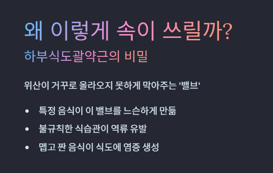 우리 몸에는 위산이 거꾸로 올라오지 못하게 막아주는 '밸브'가 있습니다. 이를 하부식도괄약근이라고 하죠. 특정 음식이나 습관은 이 밸브를 느슨하게 만들어 위산 역류를 유발합니다.