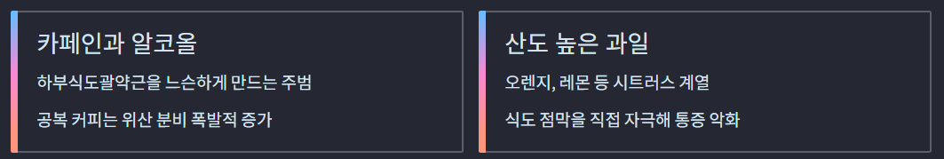 2. 커피, 술, 튀김, 매운 음식은 하부식도괄약근을 약하게 하므로 멀리해야 합니다.