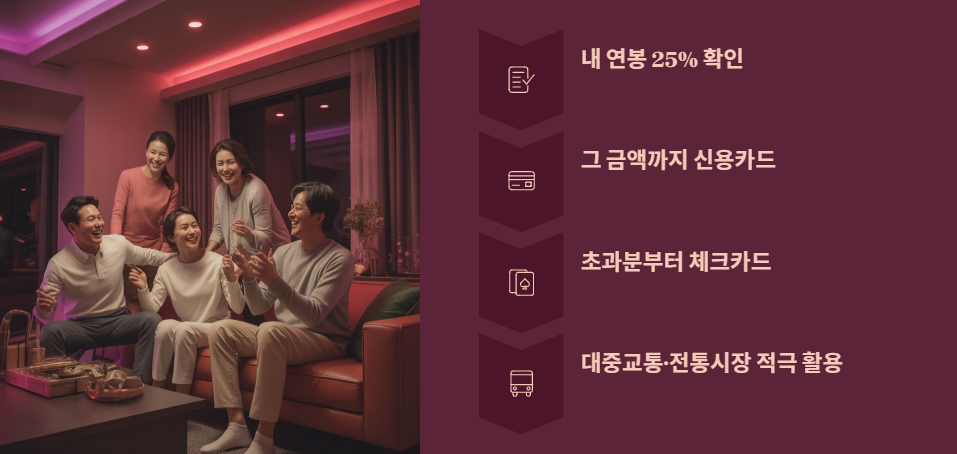 - 전략: 연봉의 25%까지는 혜택(마일리지, 할인, 포인트)이 좋은 신용카드를 사용하여 실적을 채웁니다. 그 이후 초과분에 대해서는 공제율이 30%인 체크카드나 현금을 집중적으로 사용합니다.