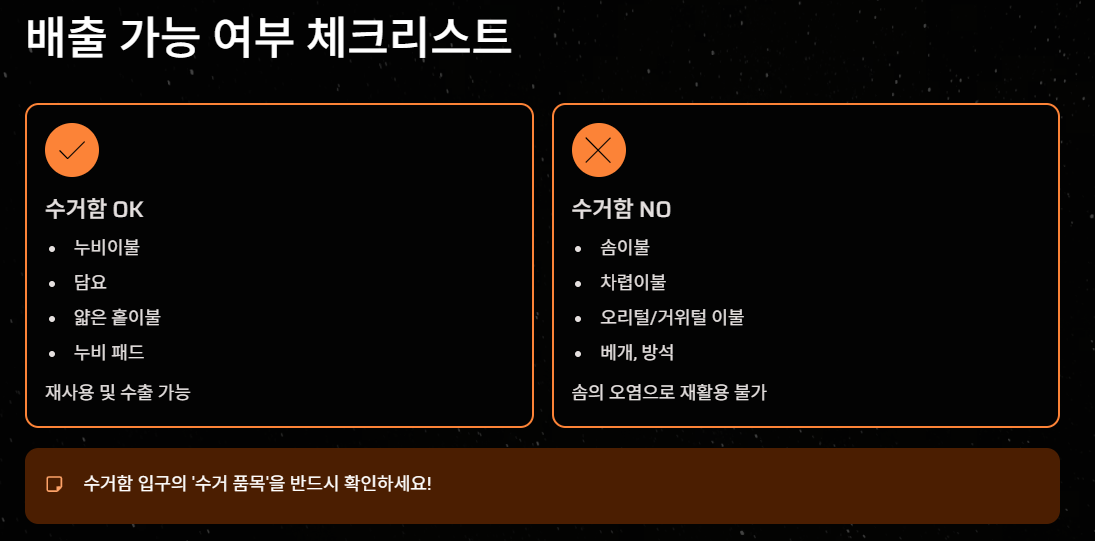 구분 배출 가능 (헌 옷 수거함) 배출 불가능 (대형 폐기물/종량제)