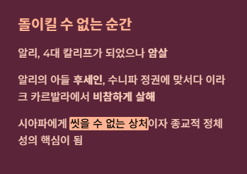 - 비극: 알리와 후세인의 죽음으로 갈등이 종교적 신념으로 승화됨.