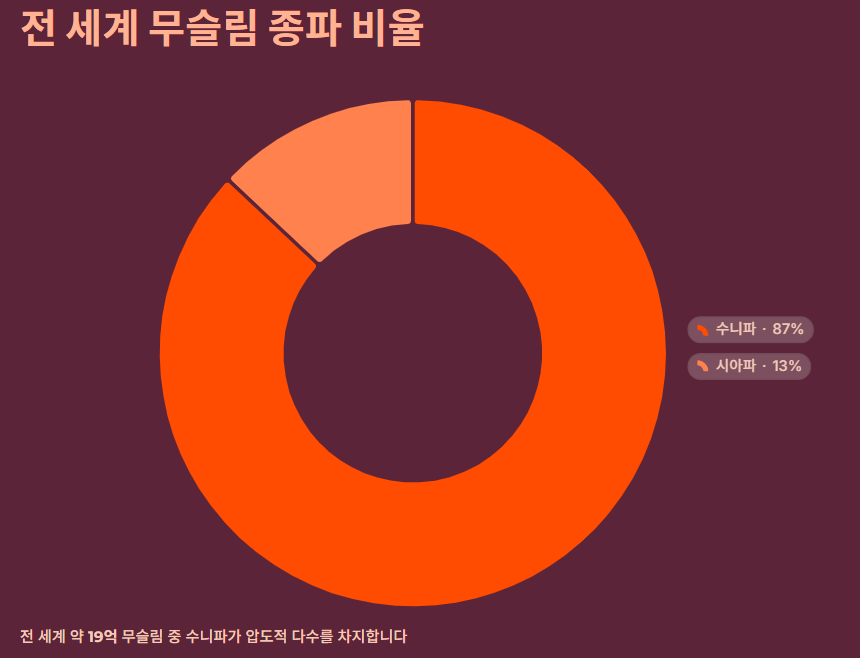 | 인구 비율 | 전 세계 무슬림의 약 85~90% (다수) | 전 세계 무슬림의 약 10~15% (소수) |