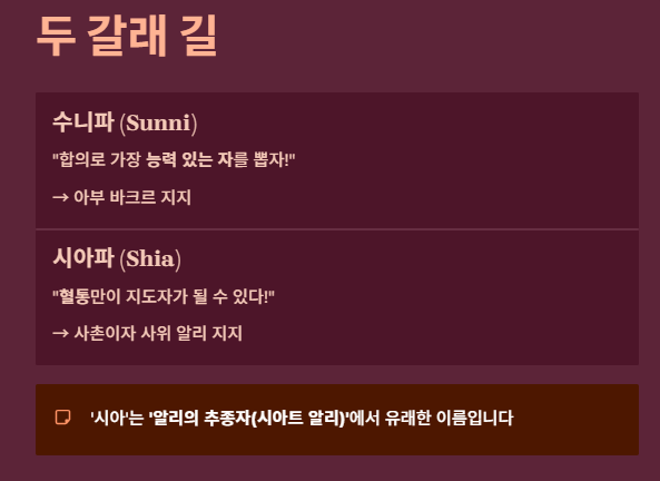 - 시작: 무함마드 사후 후계자 선정 방식의 차이(합의 vs 혈통).