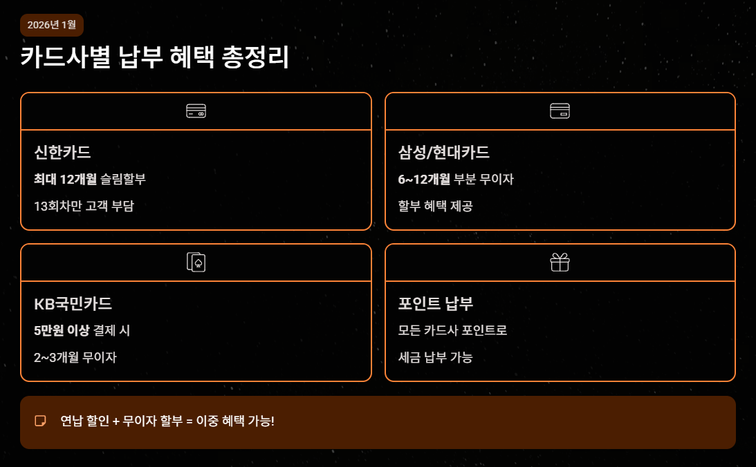 3. 카드사별 납부 혜택 (2026년 1월 기준)