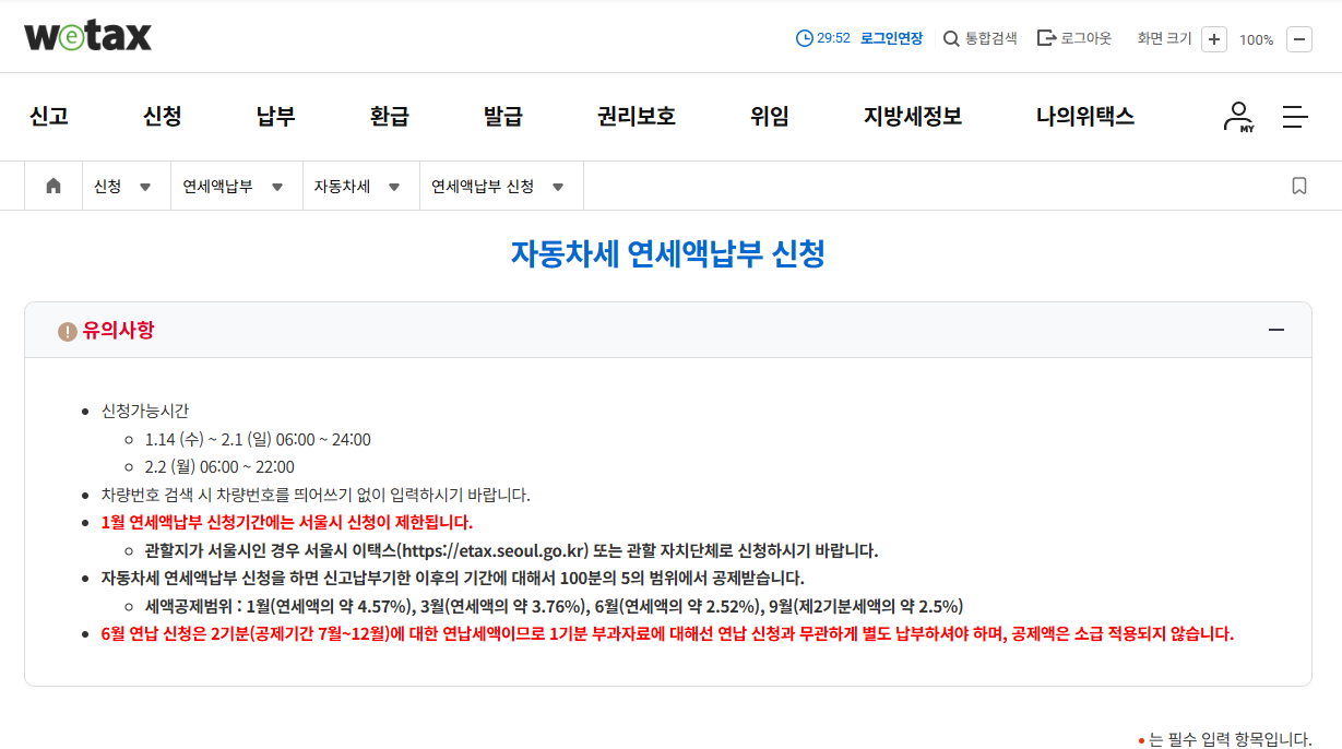 원래 자동차세는 6월과 12월에 나눠서 냅니다. 하지만 1월에 1년 치를 한꺼번에 내면 연세액의 5%를 할인해 줍니다. (정확히는 2~12월분에 대해 적용되어 실질 체감 할인율은 약 4.6% 수준입니다.)