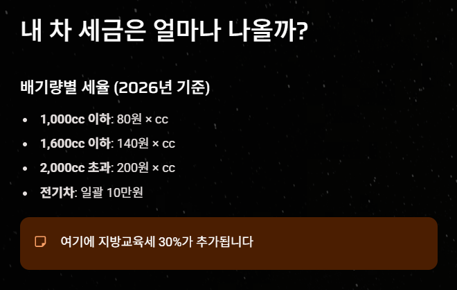 - 자동차세는 배기량에 따라 결정되며, 교육세 30%가 합산됩니다.