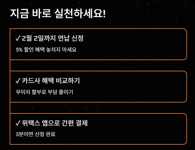 꿀팁! 연납 할인을 받고 카드로 부분 무이자를 활용하면, 지출 부담은 줄이면서 할인 혜택은 그대로 챙길 수 있습니다.