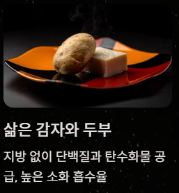 지방이 적고 단백질과 탄수화물이 풍부한 음식입니다. 두부는 수분이 많고 부드러워 소화 흡수율이 매우 높습니다. 기름에 굽지 말고 살짝 데치거나 쪄서 드세요.