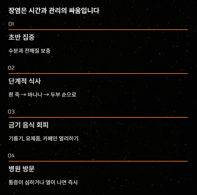 장염은 결국 **'시간'과 '관리'**의 싸움입니다.