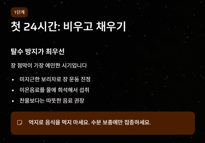 해피대디의 조언: 첫날은 금식하며 수분 위주로 섭취하고, 다음 날부터는 배고픔이 느껴질 때 조금씩 드시는 '중도'를 권장합니다.