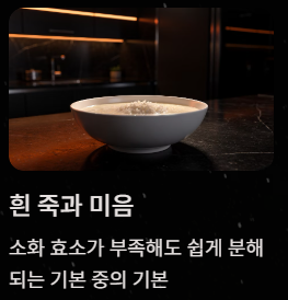 가장 기본입니다. 소화 효소가 부족한 상태에서도 쉽게 분해되며 장에 무리를 주지 않습니다. 주의할 점은 '전복죽'이나 '야채죽' 보다는 아무것도 넣지 않은 흰 죽으로 시작하는 것이 좋습니다.