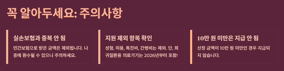 모든 의료비가 포함되는 것은 아닙니다. 성형, 미용, 특진비, 간병비 등 치료와 직접적인 관련이 적은 비용은 제외됩니다. 하지만 2026년부터 희귀질환용 의료기기 구입비가 새롭게 포함되었습니다.