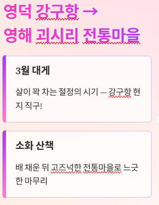 - 추천지: 영덕 강구항(대게) → 영해 괴시리 전통마을