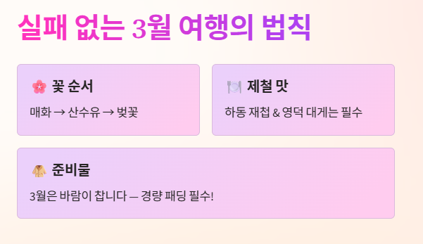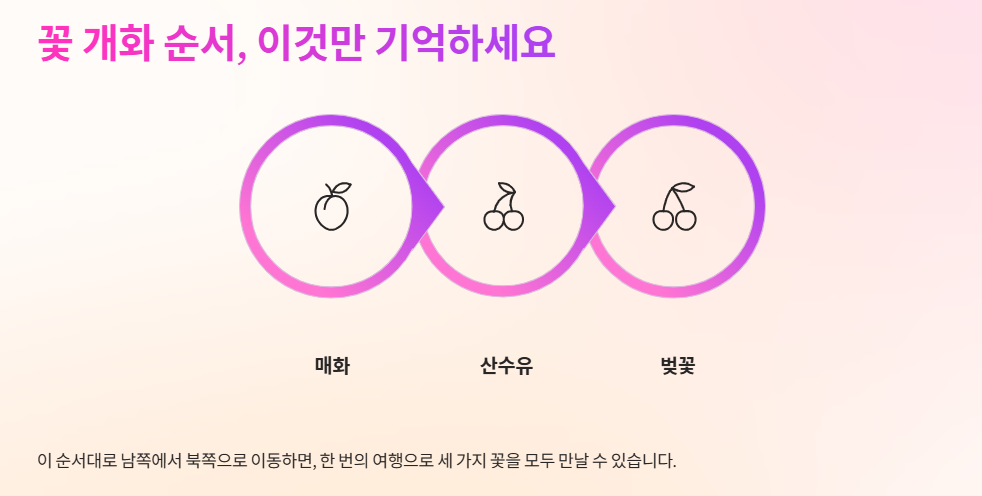 - 꽃: 매화(3월 초), 산수유(3월 중순), 벚꽃(3월 말) 순서를 기억하세요.