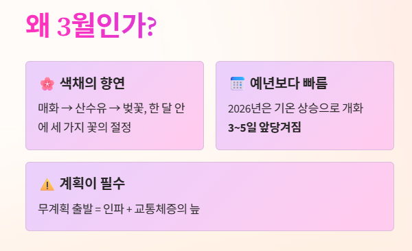 3월은 단순히 봄이 오는 달이 아니라, 대한민국 전역이 매화의 향기로 시작해 노란 산수유를 거쳐 분홍빛 벚꽃으로 물드는 '색채의 향연'이 펼쳐지는 시기입니다. 하지만 의욕만 앞서 계획 없이 떠났다가는 인파와 교통체증에 치여 "집이 최고다"라는 말만 남기고 돌아오기 십상이죠.