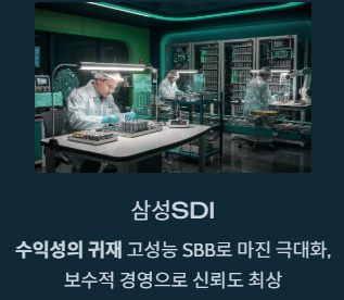 삼성SDI는 양보다 질을 따지는 기업입니다. 에너지 밀도가 높은 고성능 ESS 제품인 '삼성 배터리 박스(SBB)'를 통해 수익성을 극대화하고 있습니다. 보수적이고 꼼꼼한 경영 스타일 덕분에 중장년 투자자분들에게 신뢰가 높은 종목이기도 합니다.