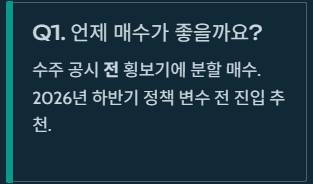 A1. 대형 프로젝트 수주 공시가 뜨기 전, 즉 주가가 횡보하며 소외되어 있을 때 조금씩 모아가는 전략이 좋습니다. 2026년 하반기 미국 대선 등 정치적 변수에 따라 보조금 정책이 변할 수 있으니, 그전에 분할 매수로 접근하십시오.