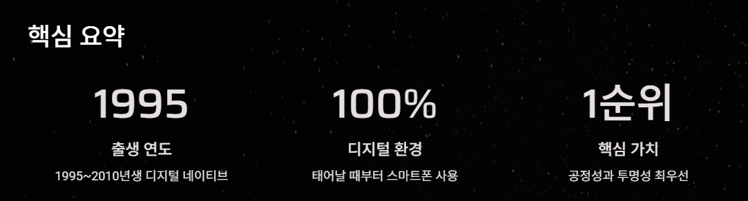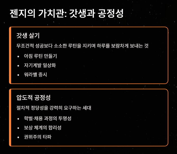 - 압도적 공정성: 학벌, 채용, 보상 문제에 있어 그 어떤 세대보다 민감하며 '절차적 정당성'을 강력하게 요구합니다.