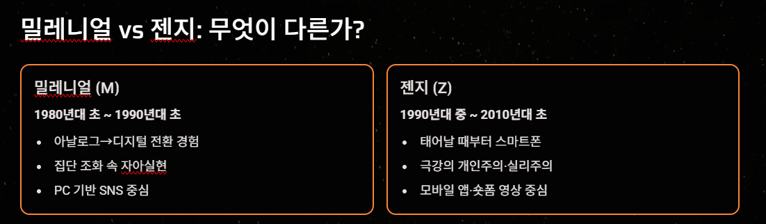 | 구분 | 밀레니얼 세대 (M) | 젠지 세대 (Z) |