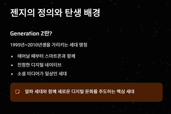 - **젠지(Gen Z)**는 1995~2010년생으로, 태어날 때부터 디지털 기기를 사용한 세대입니다.