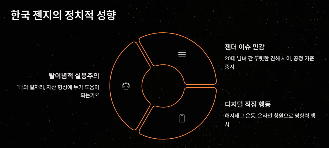 한국의 젠지는 과거 세대처럼 특정 정당에 대한 '맹목적 지지'를 보내지 않습니다. 매우 실용적이고 이슈 중심적인 참여를 보입니다.
