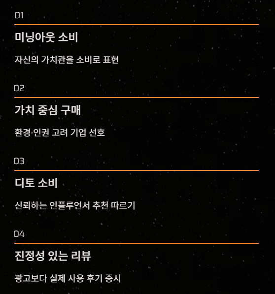 - 가치 소비: 자신이 지지하는 가치(환경, 인권 등)를 가진 기업의 제품은 비싸도 구매하고, 그렇지 않은 기업은 가차 없이 불매합니다.