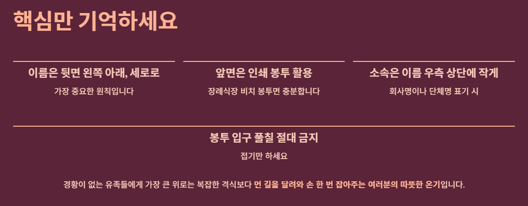 경황이 없는 유족들에게 가장 큰 위로는 복잡한 격식보다는, 먼 길을 달려와 손 한 번 잡아주는 여러분의 따뜻한 온기입니다. 봉투 쓰는 법 때문에 너무 긴장하지 마시고, 진심 어린 마음을 전하고 오시길 바랍니다.