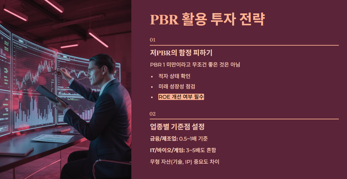 PBR이 1 미만이라고 무조건 좋은 것은 아닙니다. 회사가 적자 상태이거나 미래 성장성이 전혀 없다면 시장은 계속해서 낮은 PBR을 줄 수 있습니다. 이를 '가치 함정'이라고 부릅니다. 반드시 **ROE(자기자본이익률)**가 함께 개선되는지 확인해야 합니다.