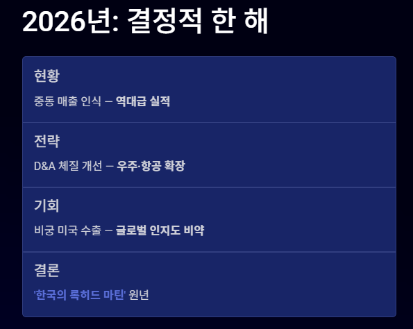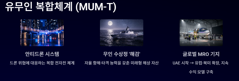 - 글로벌 MRO 기지 구축: 2026년 UAE를 시작으로 유럽과 북미에 해외 MRO(정비·유지·보수) 센터 설립을 추진합니다. 이는 무기 판매를 넘어 지속적인 수익원을 창출하려는 전략적 포석입니다.