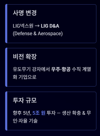 LIG넥스원은 2026년 창립 50주년을 맞아 사명을 **'LIG D&A(Defense & Aerospace)'**로 변경하며 새로운 비전을 선포했습니다.