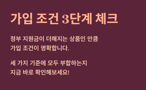 정부 지원금이 더해지는 상품인 만큼 가입 조건이 명확하게 정해져 있습니다. 본인이 다음 세 가지 기준에 모두 부합하는지 확인하는 것이 첫 번째 단계입니다.