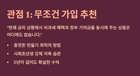 현재 금리 상황에서 비과세 혜택과 정부 기여금을 동시에 주는 상품은 어디에도 없습니다. 5년이라는 시간이 길게 느껴질 수 있지만, 종잣돈(Seed Money)을 만드는 데 이만큼 확실한 방법은 없다는 관점입니다. 특히 사회초년생이라면 강제 저축의 습관을 기르기에 최적이라는 평가입니다.