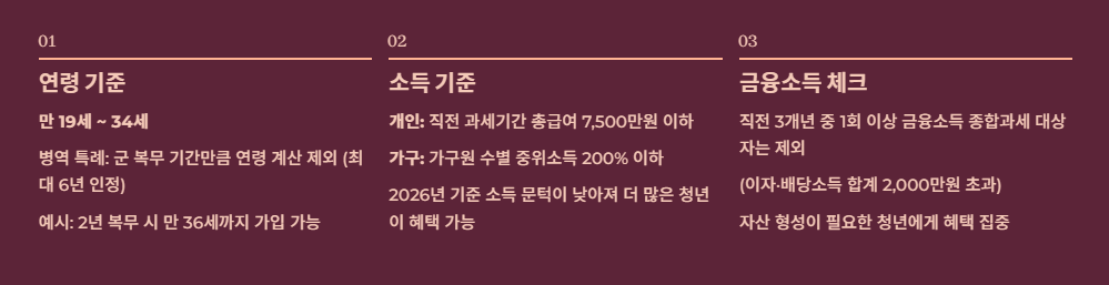 정부 지원금이 더해지는 상품인 만큼 가입 조건이 명확하게 정해져 있습니다. 본인이 다음 세 가지 기준에 모두 부합하는지 확인하는 것이 첫 번째 단계입니다.