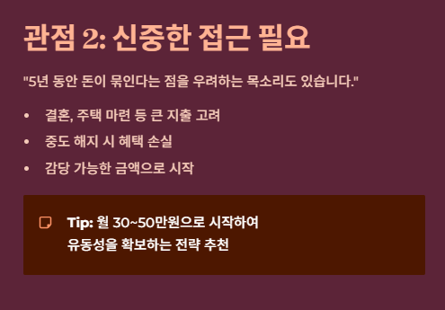 5년이라는 긴 기간 동안 돈이 묶인다는 점을 우려하는 목소리도 있습니다. 결혼, 주택 마련 등 큰 지출이 예상되는 시기에 해지하게 되면 정부 혜택을 온전히 받지 못할 수도 있기 때문입니다. 따라서 본인의 자금 계획을 면밀히 세운 뒤, 감당 가능한 금액(예: 월 30~50만 원)으로 가입하는 지혜가 필요하다는 관점입니다.