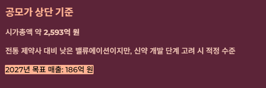 - 낙관적 시각: 기술이전(L/O)을 통한 조기 수익 창출 모델이 작동하고 있어, 2027년 목표 매출(186억) 달성 가능성을 높게 본다면 상장 후 25,000원 ~ 30,000원 선까지의 상승 여력은 충분하다는 분석입니다.