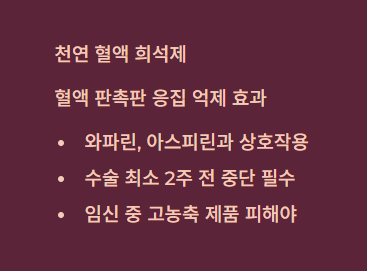 - 약물 상호작용: 와파린, 아스피린 등 혈전 용해제를 복용 중이라면 출혈 위험이 커집니다.