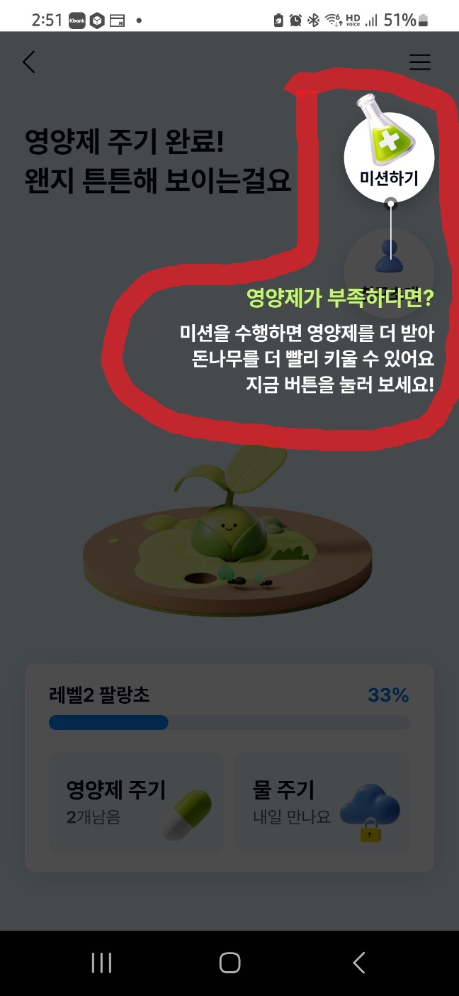 케이뱅크 앱 안에서 가상의 돈나무를 키우면서 출석 체크와 간단한 미션 수행만으로 최대 10만 원까지 현금 보상을 받을 수 있는 꿀 서비스! 매일 1분 투자로 소소한 보상을 챙겨보세요.