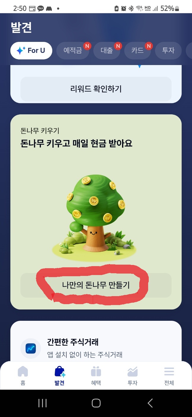 - 메인화면 또는 ‘혜택’ 탭에서 돈나무 키우기 메뉴 클릭