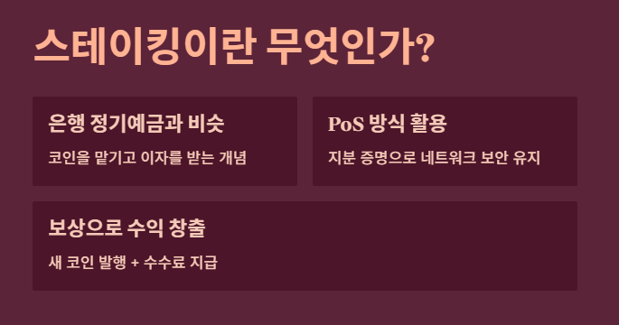 - 개념: 내 코인을 네트워크에 맡기고 보상(이자)을 받는 행위.