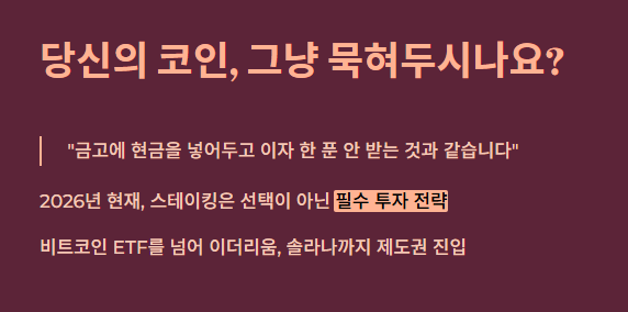 장기 투자자에게 스테이킹은 선택이 아닌 필수입니다. 단순히 코인 가격이 오르길 기다리는 것보다, 스테이킹을 통해 수량을 계속 늘려가면 하락장에서는 방어막이 되고 상승장에서는 수익을 극대화할 수 있기 때문입니다. 특히 2026년처럼 시장이 성숙기에 접어든 시점에서는 안정적인 **'현금 흐름'**을 만드는 것이 가장 똑똑한 전략이라는 의견입니다.