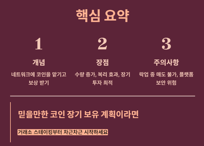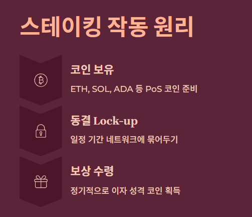 - 개념: 내 코인을 네트워크에 맡기고 보상(이자)을 받는 행위.