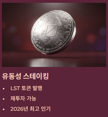 - 유동성 스테이킹(Liquid Staking): 코인을 맡기면서도 그에 상응하는 증표(LST)를 받아 다른 곳에 재투자하는 방식 (2026년 현재 가장 인기 있는 방식).