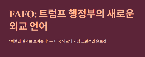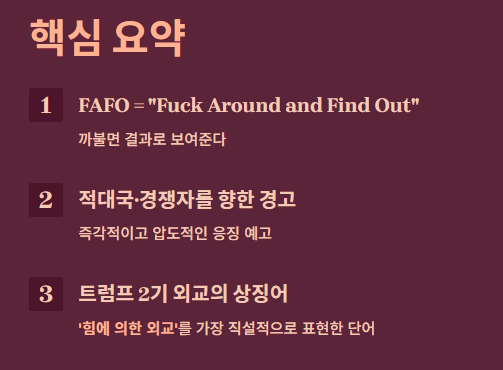 최근 트럼프 대통령과 관련하여 화제가 되고 있는 FAFO는 매우 강렬하고 직설적인 메시지를 담고 있습니다. 그 의미와 배경을 정리해 드릴게요.