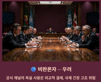 - 비판론자들: 한 나라의 공식 채널에서 욕설이 섞인 슬랭을 사용하는 것이 외교적 결례이며, 국제적 긴장을 불필요하게 고조시킨다고 지적합니다.