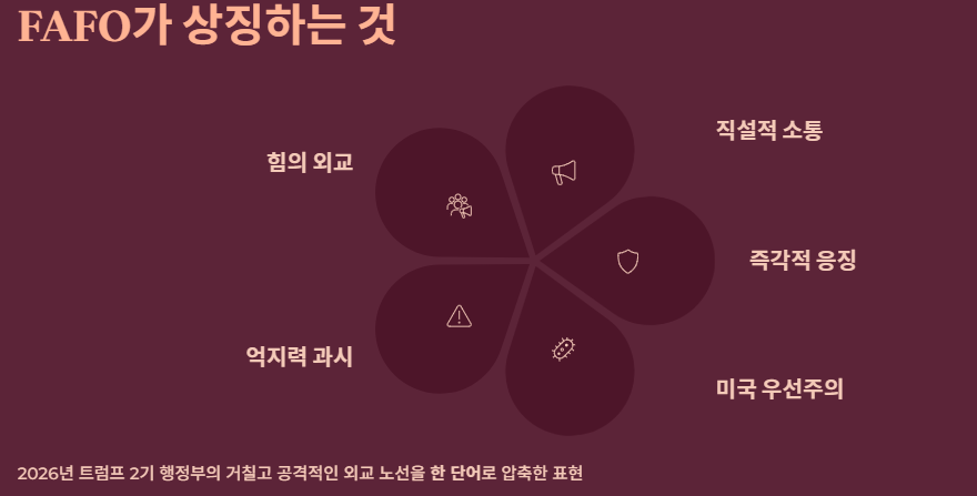 2026년 1월: 베네수엘라의 니콜라스 마두로 대통령 체포 작전 직후, 백악관 공식 SNS 계정(X, 인스타그램)에 트럼프 대통령의 흑백 사진과 함께 **"No more games. FAFO"**라는 문구가 올라왔습니다. 이는 미국의 이익을 건드리면 철저히 응징하겠다는 '힘의 외교'를 상징적으로 보여준 사건이었습니다.