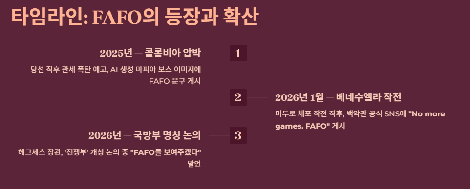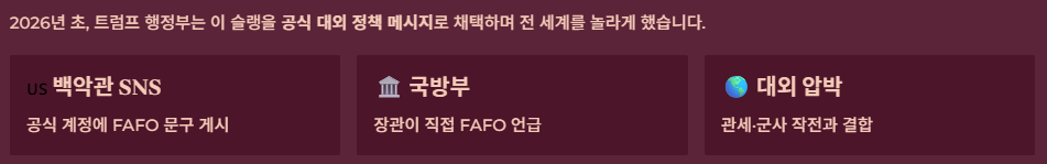 2026년 1월: 베네수엘라의 니콜라스 마두로 대통령 체포 작전 직후, 백악관 공식 SNS 계정(X, 인스타그램)에 트럼프 대통령의 흑백 사진과 함께 **"No more games. FAFO"**라는 문구가 올라왔습니다. 이는 미국의 이익을 건드리면 철저히 응징하겠다는 '힘의 외교'를 상징적으로 보여준 사건이었습니다.