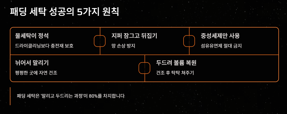 결론적으로, 패딩 세탁은 '세탁' 자체보다 **'말리고 두드리는 과정'**이 80%를 차지합니다. 이 과정만 잘 지켜주시면 내년에도 새 옷 같은 패딩을 입으실 수 있습니다!