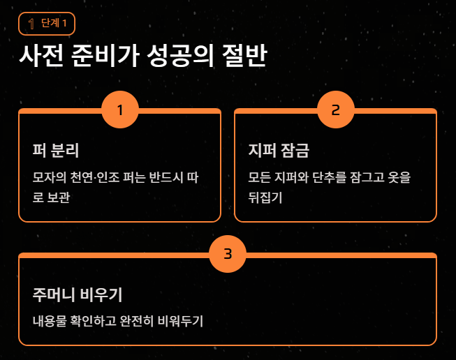 - 분리: 모자에 달린 천연 퍼나 인조 퍼는 반드시 분리해서 따로 관리하세요. (퍼는 물세탁 시 망가집니다.)
