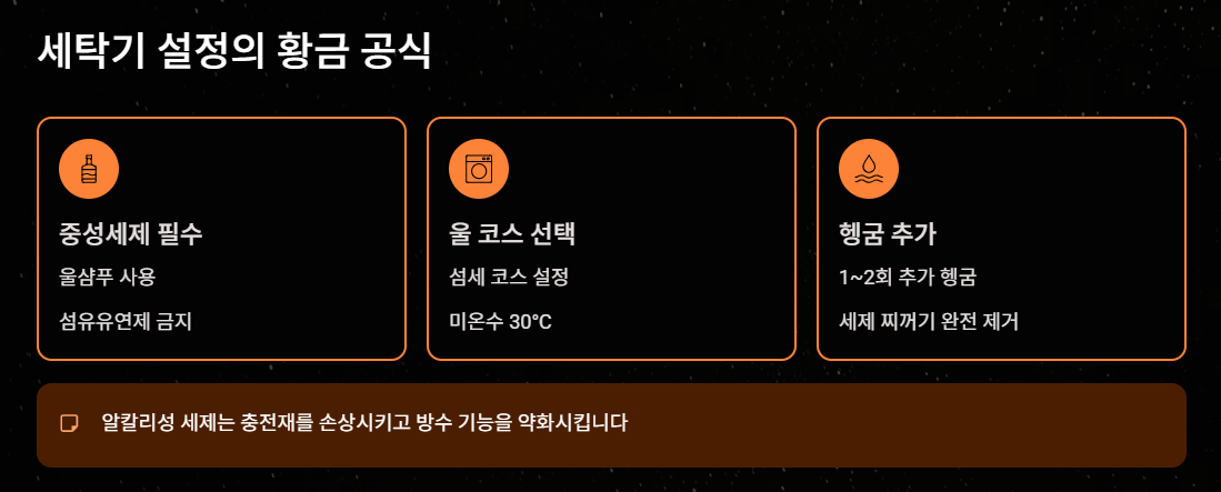 - 세제 선택: 일반 세제가 아닌 **'중성세제(울샴푸)'**를 반드시 사용하세요. 알칼리성 세제나 섬유유연제는 충전재를 손상시키고 방수 기능을 약화시킵니다.