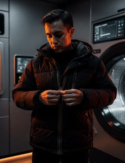 - 지퍼 잠그기: 지퍼와 단추를 모두 잠그고 옷을 뒤집어주세요. 지퍼 끝이 원단을 긁어 손상시키는 것을 방지합니다.
